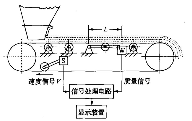 物料通過(guò)皮帶秤上方的皮帶時(shí)對(duì)皮帶有相對(duì)的壓力,壓力通過(guò)皮帶傳遞:托輯→秤架→稱重傳感器,稱重傳感器受力變化,其信號(hào)電壓mV信號(hào)也發(fā)生相應(yīng)的變化,其變化值傳到儀表。物料通過(guò)皮帶的速度等于皮帶的速度,皮帶的運(yùn)動(dòng)帶動(dòng)速度滾筒同速運(yùn)轉(zhuǎn),此時(shí)測(cè)速滾筒傳感器將測(cè)得的速度信號(hào)傳到儀表。
